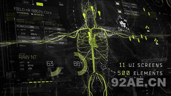 模板包含500+个HUD高科技动画元素素,可用于各种科幻短片宣传片显示屏UI元素场景中,能够修改颜色,动态速度等多种参数。
